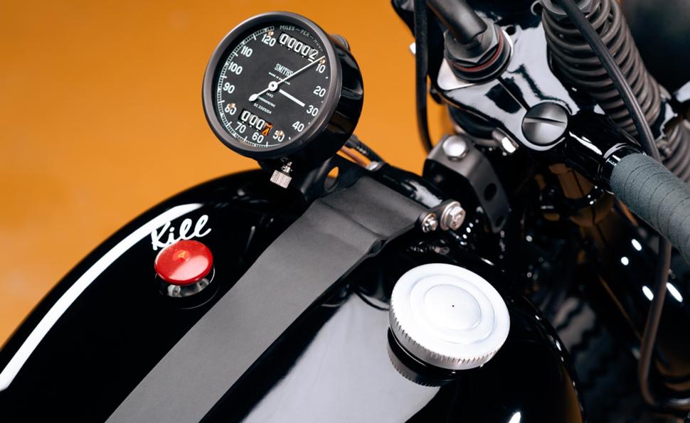 Установленные на кастомном руле переключатели света и звукового сигнала были взяты с классической Веспы. Спидометр - винтажный Smith Chronometric - снимает скорость со вторичной цепи с помощью тросика от старого Форда (Эш его умело замаскировал). Уровень масла показывается ещё одним стрелочным прибором с изменённой шкалой для большего сходства со спидометром.