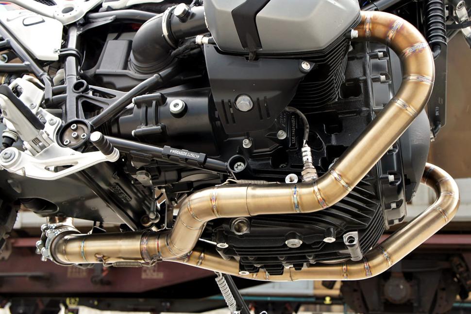 За исключением свежей цветовой схемы с топливным баком BMW R nineT ничего больше не произошло. Луи демонтировал патрубок стокового воздушного короба с правой стороны, преследуя цели сокращения веса, увеличения технических характеристик и улучшения эстетических качеств. Вместо него теперь установлена тонкая пластина из углеволокна, выкрашенная в белый цвет, который отлично гармонирует с матовым черным.
