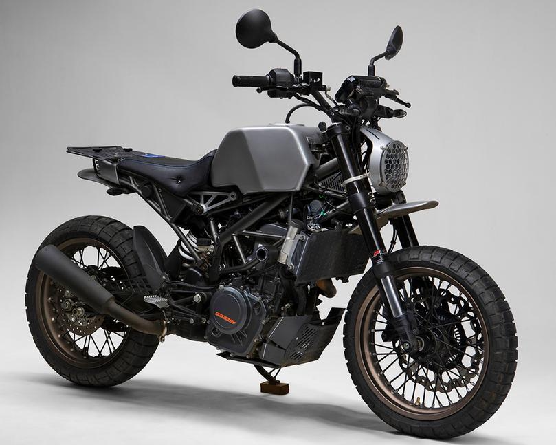 Окраску выполнили Nikki Garage: простая серая краска подчёркивает скелет KTM 390 Duke, а маленькая эмблемка на верхней плоскости бака гласит "Distance over time" - личная мантра Акаша, означающая “Расстояние во времени”.