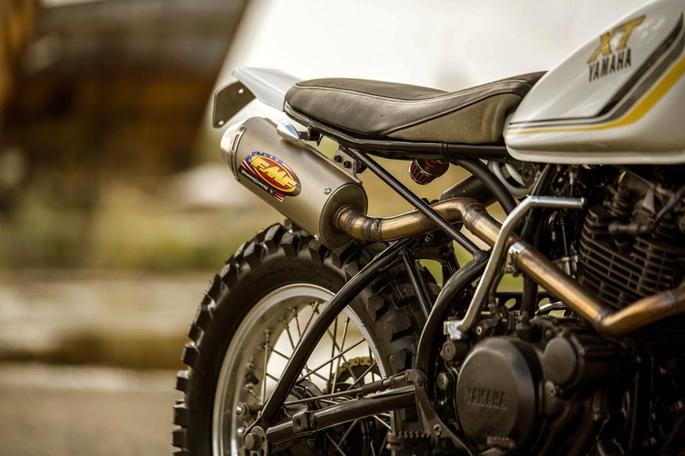 Закончив с дизайном, приступили к силовой установке Yamaha XT250 MX. Двигатель демонтировали, очистили и установили новое сцепление. Смесь готовит карбюратор Mikuni с фильтром DNA, который был покрашен в радикально черный цвет. После окончательной сборки мотоцикл попал на динамометрический стенд в дружественный гараж Dynomite Moto.