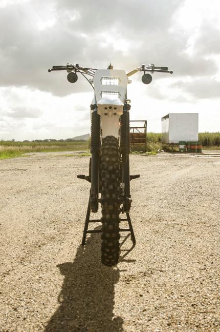 Yamaha XT250 MX получил невысокий руль Renthal, MX машинки со стандартными рычагами тормоза и сцепления, грипсы профессионального уровня, а также кастомные зеркала. Спереди было установлено универсальное крыло Super Motard и изготовленная в ручную алюминиевая панель, в которой разместились светодиодные фары, а по бокам которой светодиодные поворотники. На передней панели также разместились защитные дуги из нержавеющей стали от Iron & Resin Garage, которые похожи на ручки от ящиков! Вот что может случиться, если всю жизнь не вылезать из гаража на белый свет.