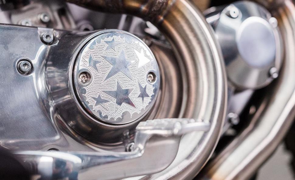 Прежде чем устанавливать двигатель в раму, Уве обработал его сухим льдом, который по сути является диоксидом углерода. В результате двигатель снова засиял. Если присмотреться внимательнее, то на крышках можно увидеть интересную гравировку. Это работа Карстена Эрстермана. Двигатель соединяется с изготовленной вручную выхлопной системой. Элементы выхлопной системы сварены из нержавеющей стали, а глушитель Уве нашел в недрах своей мастерской и даже не может точно определить его модель.