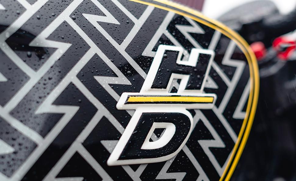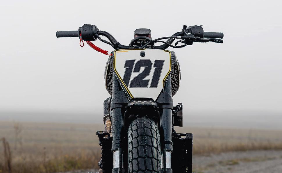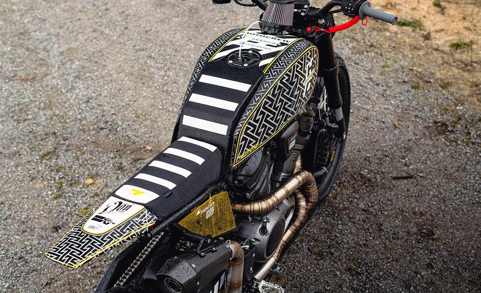 Проекту спортивный флэт-трекера придаёт законченность шикарная ливрея от постоянного соучастника Motocrew - Pablo Custom Painting из Гельзенкирхена. Polsterwerk из Берлина обшили под стать ливрее седло. Всё это выглядит быстро и безумно, а новые панели бака украшают кастомные значки Harley Davidson.