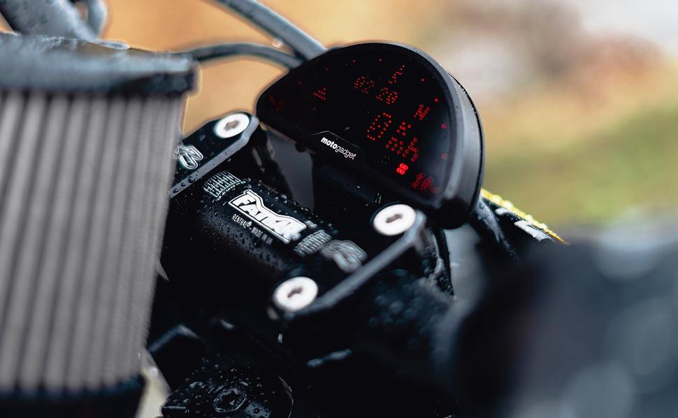 Спереди мастер заменил руль с грипсами на Renthal и установил необходимый аварийный выключатель с чекой. Также мотоцикл может похвастаться первой в линейке Motogadget приборной панелью, совместимой с мозгами Harley. Это значит, что Крис смог сохранить мотоциклу полный электронный функционал, включая режимы езды, при этом убрав громоздкий TFT-дисплей. Мотоцикл провёл неделю в Берлине, в штаб-квартире Motogadget, пока они дорабатывали софт приборки.