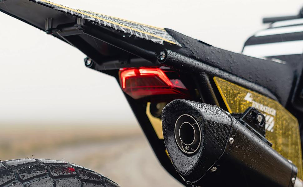 Боковые крышки были сделаны полупрозрачными не просто так: они позволяют наблюдать за кастомной подвеской от Touratech. Задний амортизатор с выносным резервуаром имеет пружину с прогрессивной характеристикой жёсткости, а преднатяг её настраивается удобным ручным выносным регулятором, равно как и сглаживание сжатия и отбоя. Вилка выглядит стоковой, но на деле была укорочена и перебрана с внутренними компонентами от Touratech.