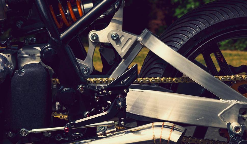 Сзади работа заключалась в переделке и зачистке подрамника Royal Enfield. А поскольку заднее колесо стало шире стокового, переднюю звезду пришлось вынести в сторону, что в свою очередь потребовало расширить раму.