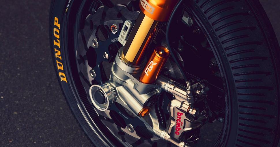 Тормоза кастом Continental GT 650, никелированные гоночные Brembo, стоят на дисках Galfer, подключены к магистралям Venhill и мастер-цилиндру Magura. Для симметрии Энтони установил ещё и гидравлический привод сцепления, тоже от Magura.
