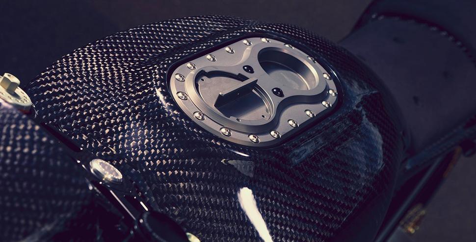Марк Ангус из 3Dcnc на 3D-фрезере сделал пару моделей обвеса дляRoyal Enfield Continental GT 650, которые Энтони слегка доработал, а затем отправил изготовителю форм. Затем в этих формах были изготовлены карбоновые элементы обвеса. Бак по нужным размерам сделали GIA Engineering, оснастив его крышкой от Racefit. Они же изготовили прочный маятник, подвешенный на амортизаторе Öhlins TTX GP Pro. Вилка Öhlins FGR300 установлена в кастомные траверсы от FastTec, которые также предоставили для мотоцикла быстросъёмные оси в GP-шном стиле. Карбоновые колёса изготовлены BST и обуты в Dunlop Sportmax GPA.