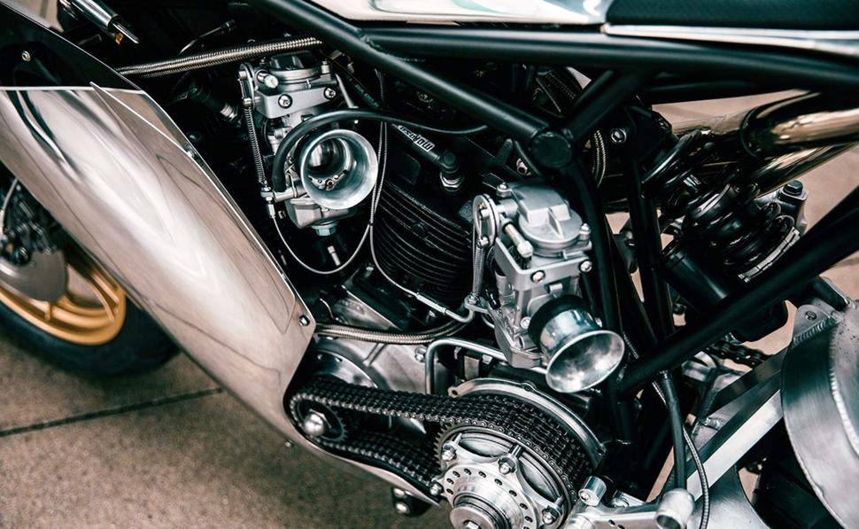 Большинство высокотехнологичных элементов, созданных Максом, находятся на виду, но некоторые прячутся под изысканным алюминиевым обвесом. Маслобак находится прямо под топливным баком, и он оснащён внешним фильтром и радиатором. Макс сам изготовил металлические элементы - от обтекателя до 11-литрового бака и "осиного" хвоста.