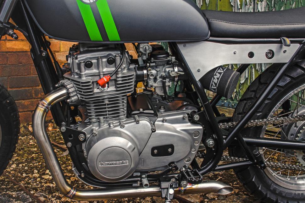 Мотоцикл Kawasaki Z400 был снова собран, к двигателю подключен подобающе злой выхлоп и сдвоенный воздушный фильтр в стиле Ramair. Новый комплект пультов выглядит предельно лаконичным, как и двойная диодная фара и новый кожух аккумулятора. Приятным улучшением передней тормозной системы стал суппорт Brembo, снятый с BMW.