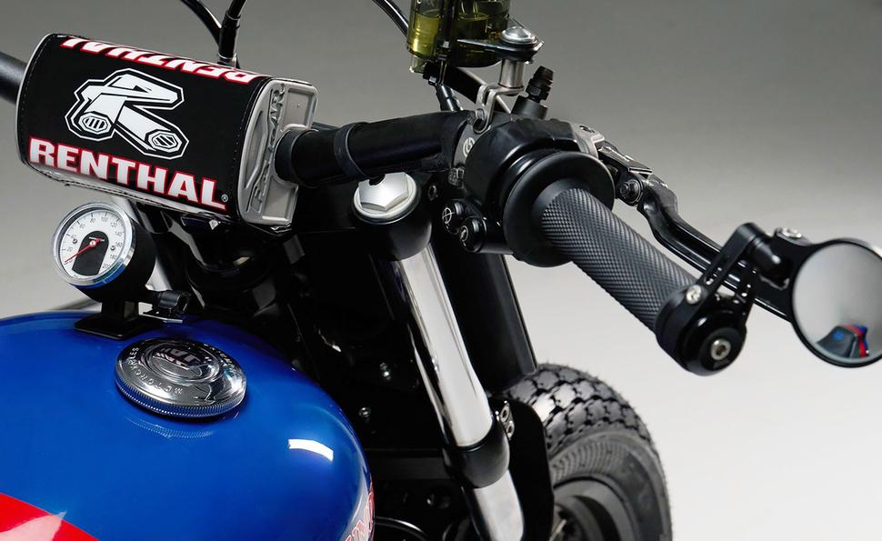 Широкий флэт-трекерный руль Renthal установлен на вынесенных назад проставках и оснащён пультами, корпуса которых напечатаны на 3D-принтере. Ещё Mandrill установили на руль рычаги от Brembo и пару крошечных зеркал в торцах грипс. Спидометр тоже крошечный - это Motogadget Motoscope Tiny на кронштейне, прикреплённом к бензобаку.