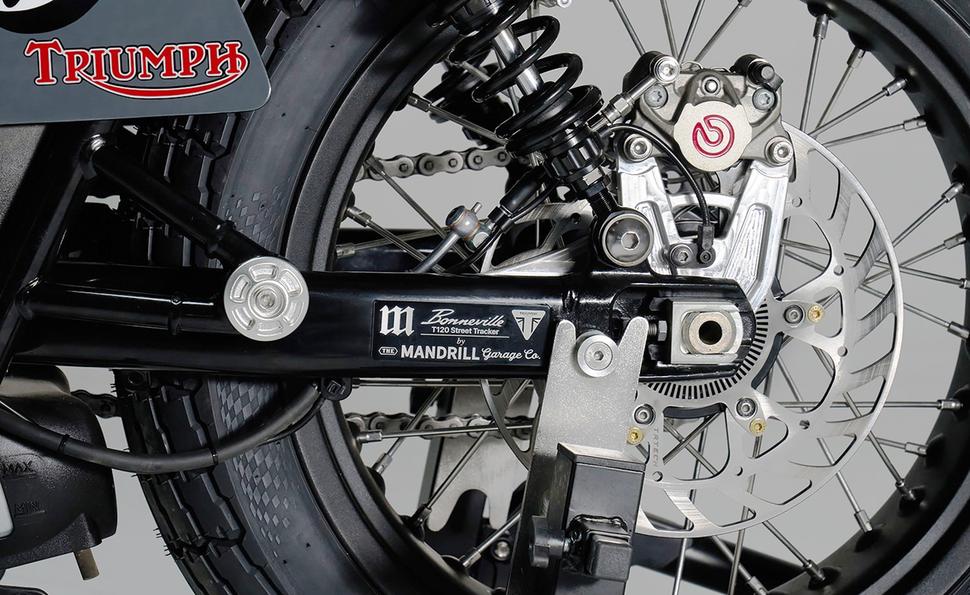 И, наконец, команда изменила осанку Triumph Bonneville T120, вместо 17-го заднего колеса установив 18-е, как спереди. Среди других доработок - задние амортизаторы Ohlins и суппорта Brembo на обоих колёсах.