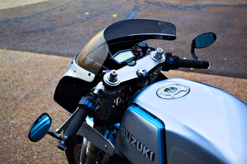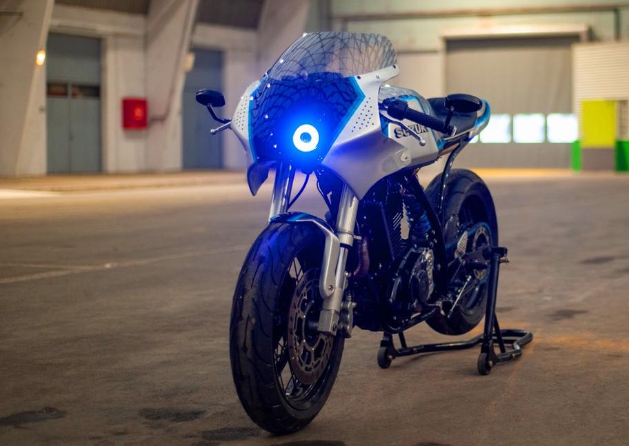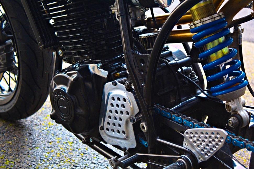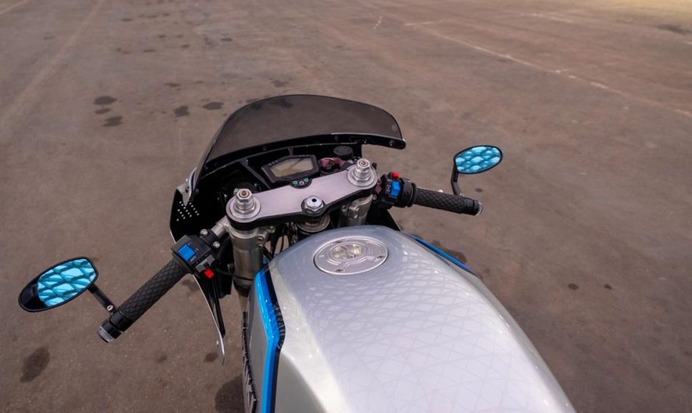 Много чего - проложил выхлоп, сделал алюминиевый хвост, алюминиевый кожух цепи, подножки, отсек для электрики, заднюю часть рамы, крепления суппортов, переделал бак от GSX G, сделал крепление спидометра, переднего обтекателя… только сиденье и окраску делал не сам.