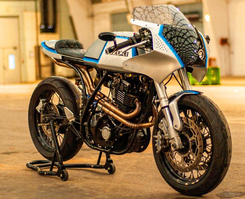 Задача была сделать кафе-рейсер с перевёрнутой вилкой и на спицованных колёсах, а дальше по обстоятельствам. Я частенько меняю своё мнение, обдумывая дизайн мотоцикла, комбинирую формы, силуэты, выбираю готовые элементы обвеса так, чтобы всё это было в гармонии друг с другом. Например, в последний момент я решил поставить обтекатель вместо простой круглой фары - отчасти под влиянием GP500.