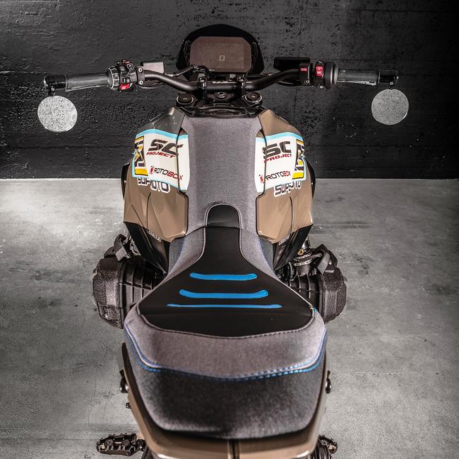 Чтобы придать обвесу завершённость и аккуратно подогнать его под 17-дюймовое колесо, одно из фирменных карбоновых крыльев производства VTR, изначально предназначенное для S 1000 RR, установили на кастомном креплении. Теперь, когда холст стал намного чище, ребята смогли воплотить на нём свой эскиз под названием Monster Moto. Основной цвет типично приглушённый, как эти ребята любят, и на его фоне особенно чётко и стильно смотрится графика. Яркие нежно-голубой и ядовито-жёлтый цвета сияют, в том числе и на мелких деталях - например, синий на значке BMW, а жёлтый - на линзе фары. Чёрный цвет использовали для визуального уменьшения мотоцикла на некоторых компонентах, а на клапанных крышках нанесено рифление.