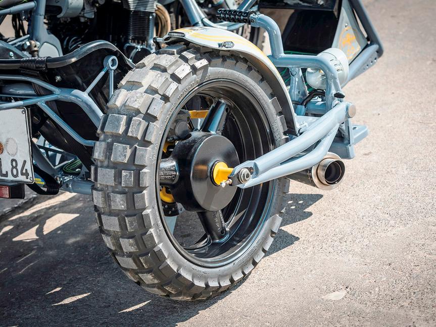 Ещё из коробки с запчастями Suzuki GSXR была взята тормозная система - большие двойные диски и суппорта Tokico, а также все три колеса. Мощная резина Continental Twin Duro придаёт мотоциклу крайне суровый вид, причём на коляске колесо установлено на кастомной ступице. Для комфорта новобрачных нужны были новые сиденья, и Марко изготовил кастомный подрамник для Bandit-а, а в коляску установил лёгкое гоночное седло для картинга. Оба сиденья и пол в коляске были обшиты хорошим другом Беном в чёрную кожу с жёлтой отстрочкой.