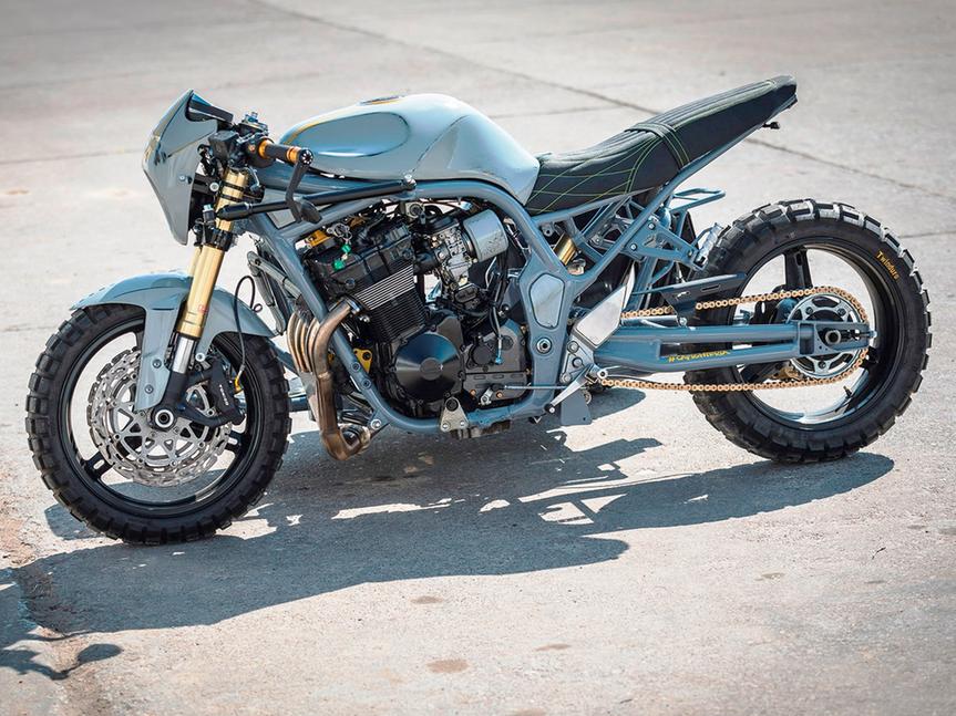 Именно здесь, под вывеской Cafighteria, он строит свои "психо-мотоциклы", а вот на этом Suzuki Bandit с коляской он приехал к алтарю со своей тогда ещё будущей женой.