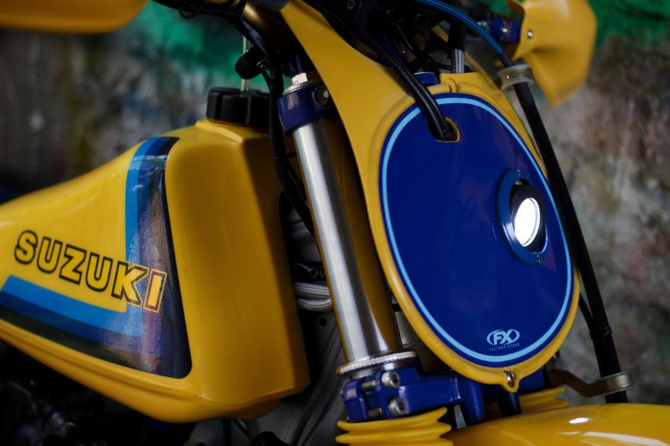 Сверху поместился желтый топливный бак Suzuki RM250 / 400, который мгновенно отсылает мотоцикл в нужную эпоху. До того, как были установлены крылья Suzuki RM, с добавлением мини-обтекателя, была сделана еще одна кастомизация - сиденье. Оно представляет собой модифицированное заводское основание DR, которое получило новую набивку и покрытие из синего винила Suzuki.