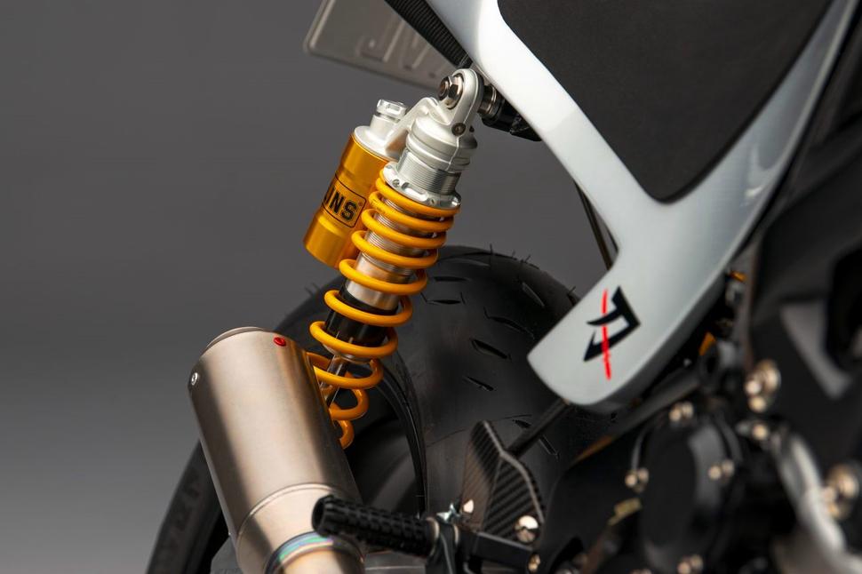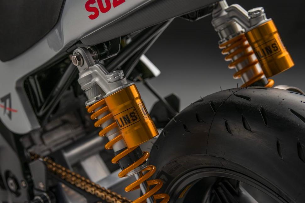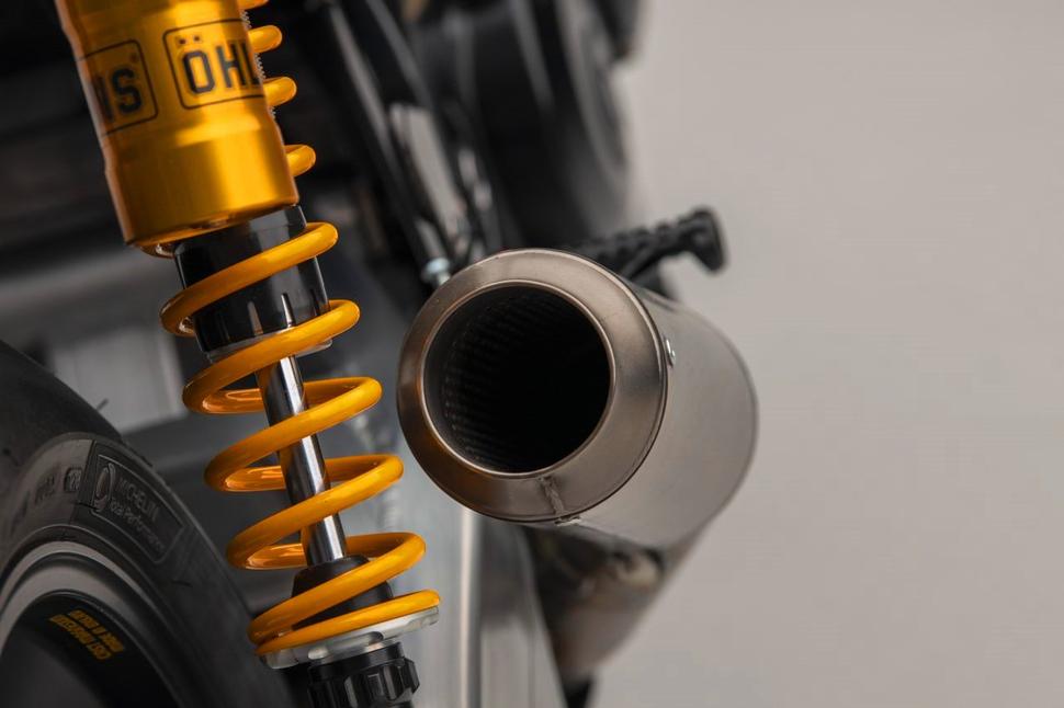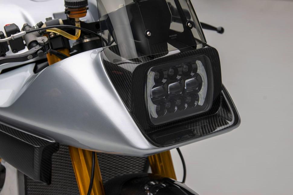 Что касается обвеса, сиденье состоит из основы от гоночной модели от Team Classic Suzuki, доработанной для совместимости с WSBK-шным бензобаком, а спереди стоит обтекатель NOS Katana из каталога Suzuki Vintage Parts Programme, расширенный на 2 сантиметра под вилку Ohlins. Затем по формам седла и обтекателя были сделаны карбоновые панели, закрывающие все щели. Весь крепёж и фиттинги изготовлены Racefastener.