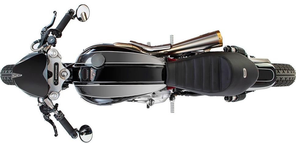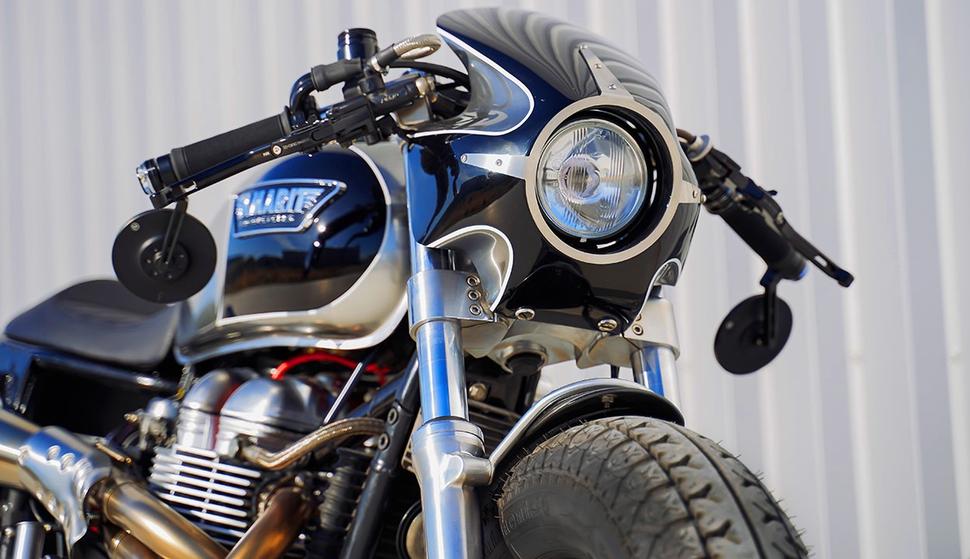 Компактный обтекатель — это доработанный вариант Tamarit-овского же фейринга для проекта Gullwing на базе Thruxton. Кастомная верхняя алюминиевая траверса чрезвычайно лаконична, а спидометр от Motogadget теперь встроен в бак.