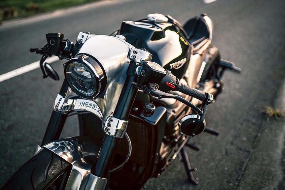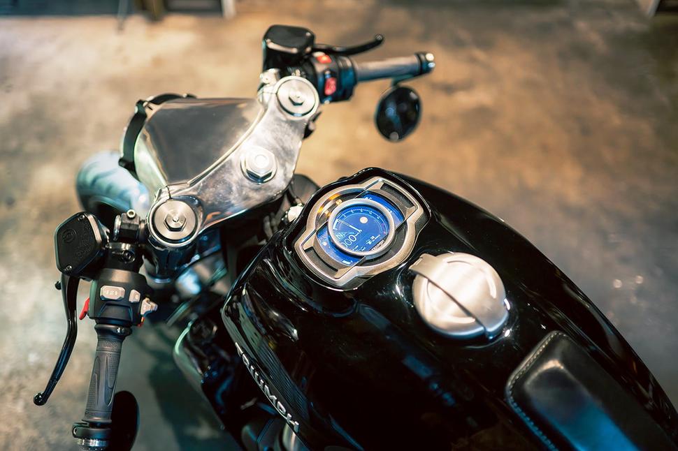 Выше CW Zon изготовили корпус для штатной TFT-приборки, встроив её в бензобак с эффектом формовки. Далее, верхняя траверса была очищена от следов проставки руля и крепления приборной панели, а вместо стандартного руля установили кастомные клипоны со штатными пультами и рычагами Triumph и новыми зеркалами в торцах грипс.