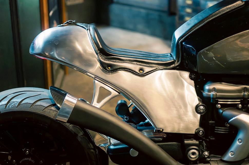Хвостовая часть Triumph Rocket 3 тоже изготовлена из алюминия, повторяя линии классических кафе-рейсеров, но с органическим оттенком, типичным для творений Юичи. Она обтянута великолепной кожаной обивкой от Куурейонсоку, постоянного партнёра CW Zon, с соответствующей накладкой на баке спереди и пряжкой сзади. Но одна из лучших частей этого проекта кроется под сиденьем…