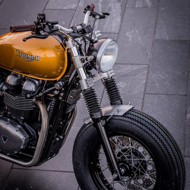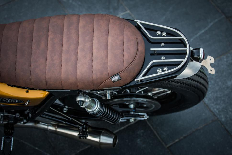 Под сиденьем можно увидеть боковые панели JVB-moto. Заднее литое крыло, которое крепится на болты, также подходит всем моделям Bonneville.
