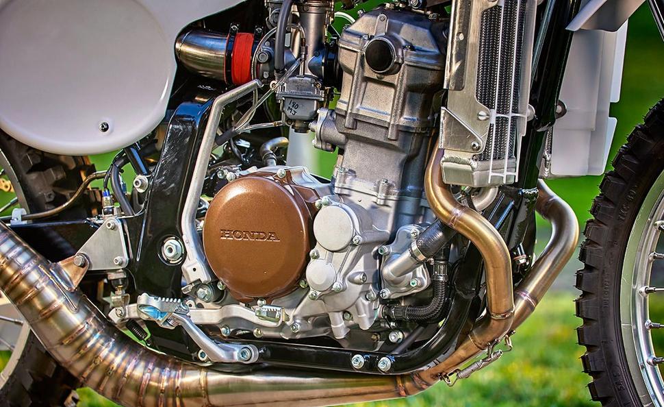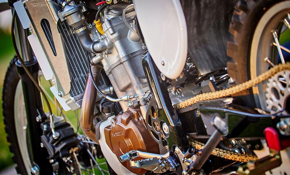Вообще Honda XR650R ближе к раллийным мотоциклам, чем к кроссовым - он больше по части путешествий, а не гонок с прыжками. Однако, его мотор с жидкостным охлаждением выдаёт чуть больше 60лс, а весит XR слегка за 140кг благодаря алюминиевой раме и легковесной конструкции мотора, так что он достаточно бодрый даже по современным меркам. Мул начал с того, что разобрал XR650R до рамы и занялся оптимизацией подвесок.