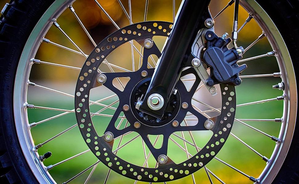 Передний тормозной диск - Magura Supermoto, а суппорт на нём - от Triumph Bonneville.