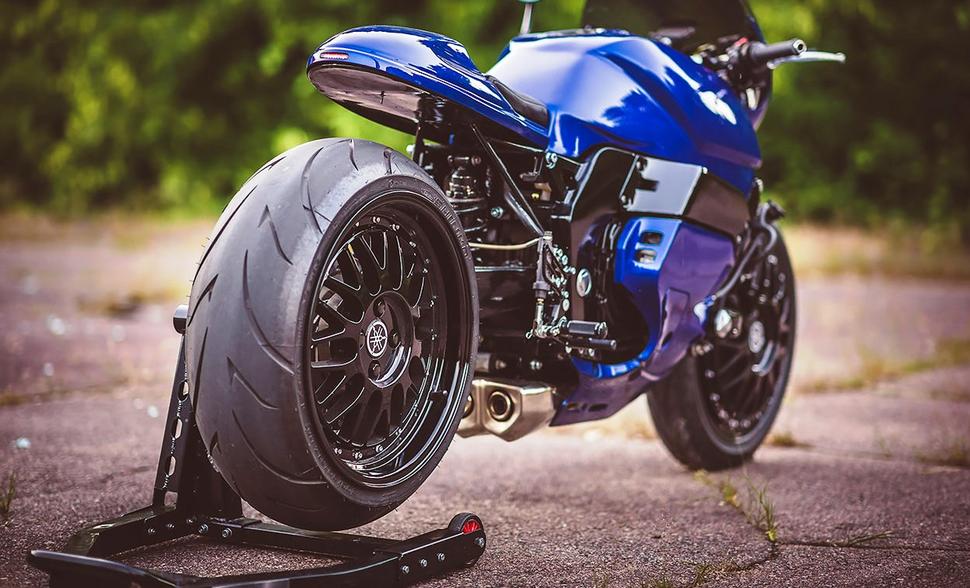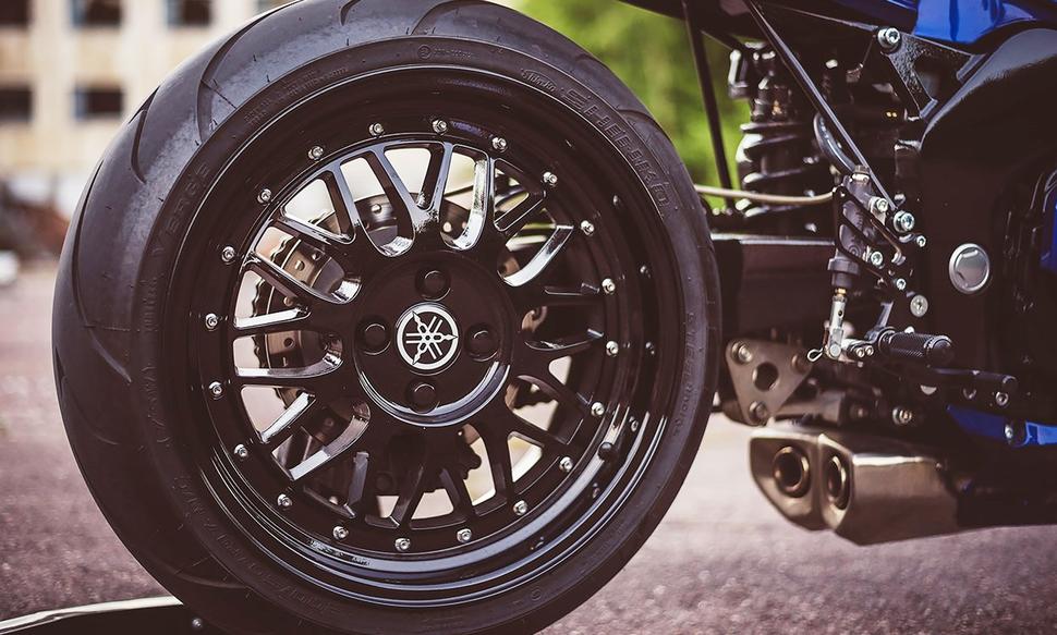 Решением стало вырезать центральную часть автомобильного диска и приладить её к ободу от Yamaha FZR1000. Скрепляются эти элементы при помощи специального переходного кольца, приваренного к боку колеса FZR. Кроме того, такая конструкция позволила сохранить штатный шестипоршневой суппорт GTS1000.