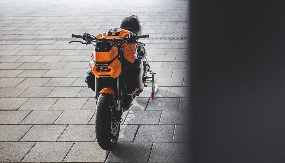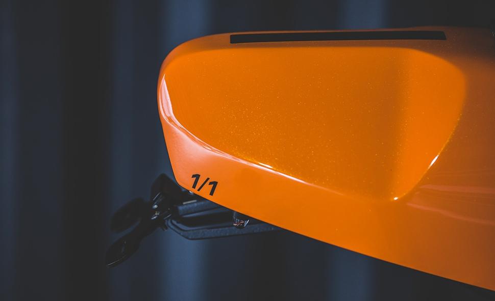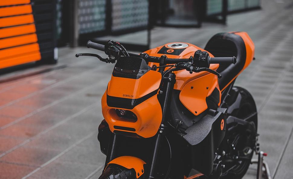 К слову о цвете, оранжевый подходит далеко не всем. Но в данном случае мы имеем дело не с обычным оранжевым. Это оттенок McLaren 570s. В хвостовой части можно увидеть эмблему 1/1, потому что данный мотоцикл вошел в серию deBolex One of One.