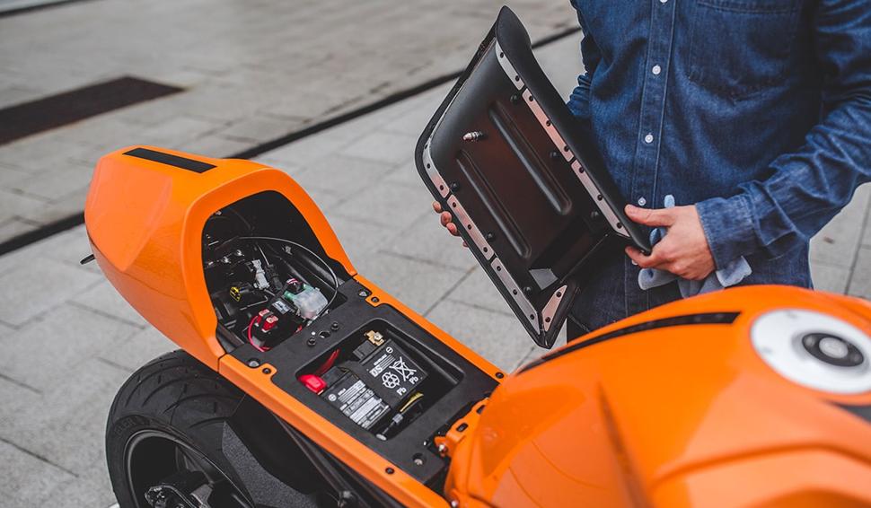 В общую картину отлично вписались задний фонарь, рамка номерного знака и задние поворотники. Седло, обитое алькантрой и винилом, легко снимается, обеспечивая доступ к электронике.