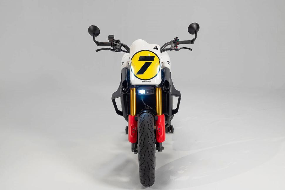 Вот тут-то и начинается самое интересное: мотоцикл можно оставить как есть, а можно добавить ещё что-нибудь из каталога Bottpower. Заказчик конкретно этого мотоцикла выбрал ещё карбоновое переднее крыло со встроенными кожухами вилки. Кстати, он же сделал эти снимки, а главное - выбрал расцветку и графику для нового обвеса, вдохновлённую легендарной схемой аса Grand Prix Барри Шина с бело-красно-жёлтой графикой и семёркой, выполненной легендарным гоночным шрифтом на глянцевом карбоне.