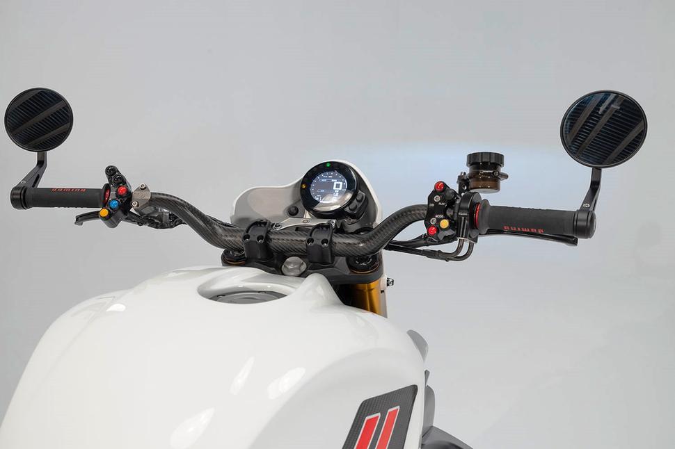 Новый карбоновый руль от Bottpower установлен на новых проставках. На руле стоят оригинальные фрезерованные гоночные пульты, короткоходная ручка газа Domino, радиальный мастер-цилиндр от Brembo, а тормозные магистрали армированы нержавейкой. Оба задних крыла - из карбона, а держатель номера вместе с одним из них крепится на фрезерованном на ЧПУ кронштейне.