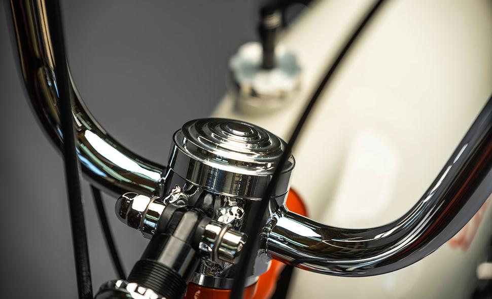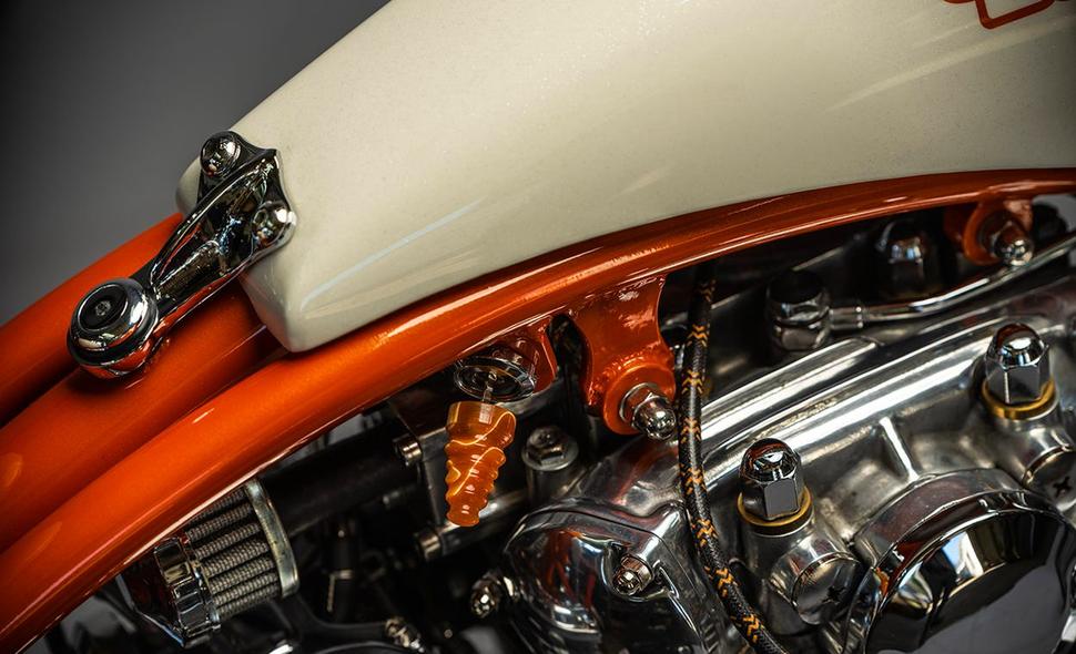 Мотоцикл отделан множеством тщательно продуманных самодельных деталей. Внимание к мелочам поражает, оно видно даже на сугубо функциональных вещах, таких, как бензокран и задний кронштейн бака.