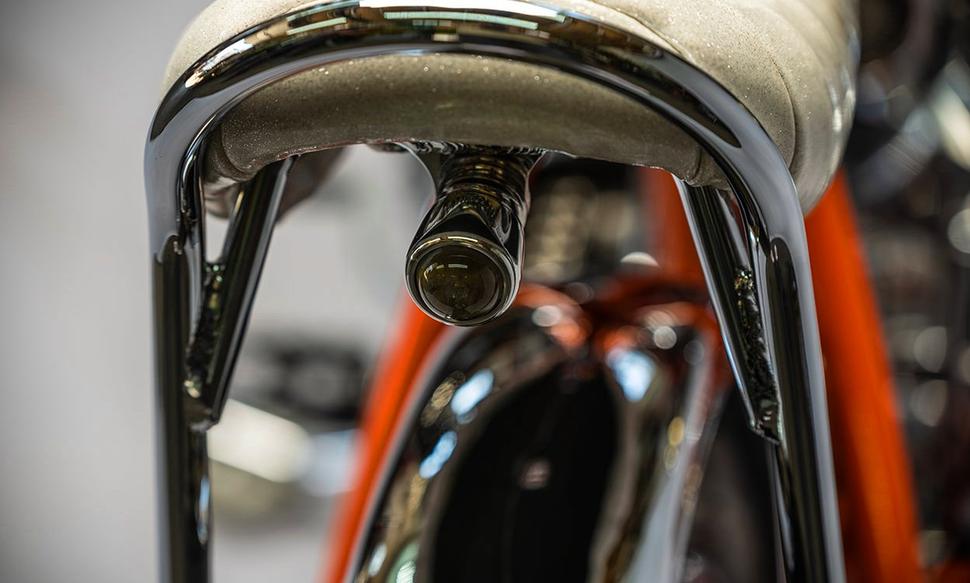 Оригинальный Schwinn Stingray имеет в нижней части сисси-бара амортизаторы, на которых подвешено седло, и Шон был железобетонно уверен в необходимости повторить это. Он взял несколько пружин и втулок от McMaster-Carr и обработал все детали для воссоздания полноразмерной копии винтажных амортизаторов сиденья. Передняя часть седла подвешена на хитроумно спрятанном шарнире.