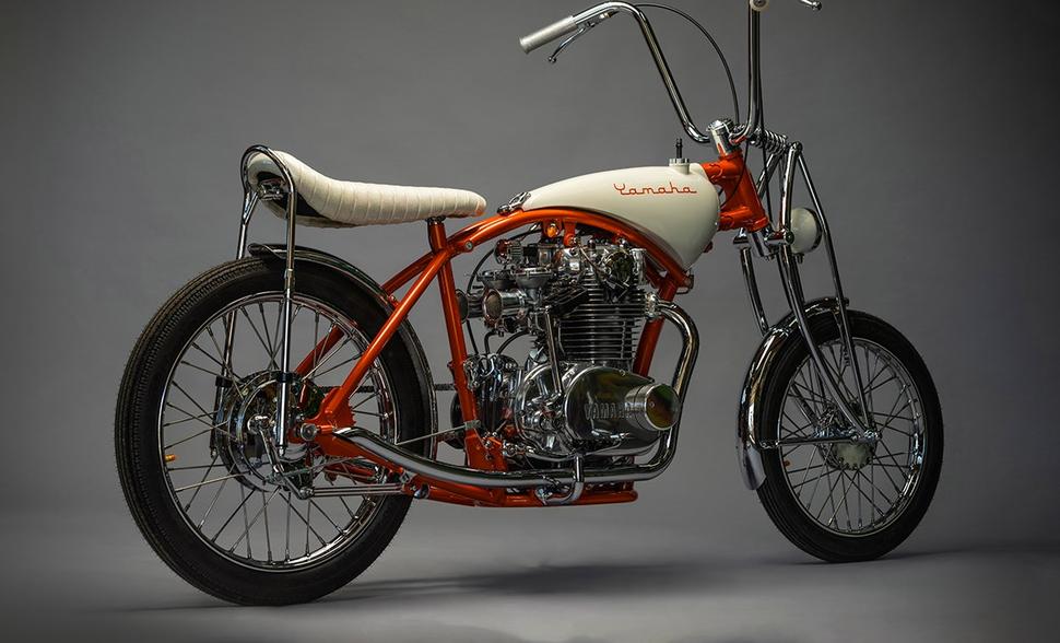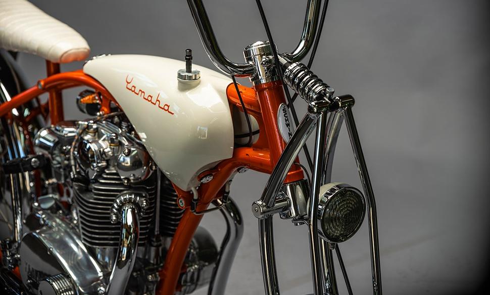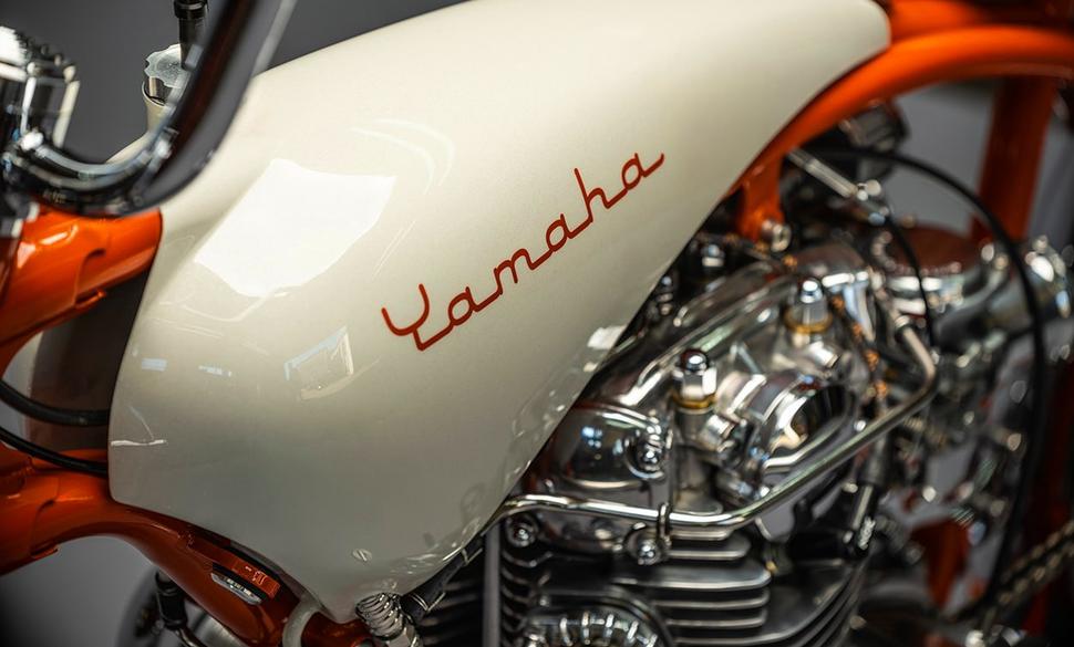 Шикарная расцветка потребовала работу целой команды. Оранжевый кэнди на раму нанесли Right A Way Powder из Миддлтауна, а DGM Chrome Plating из Филадельфии выполнили хромирование. Роксан из Range Needlework в Аризоне выполнила обшивку сиденья из шикарного ретро-винила с белыми блёстками. Дэнни Найт из Knights Kustoms, что в Винчестере, штат Вирджиния, нанёс на бак густой слой блёсток в толще белой краски, а Джон Ральф из Quail Run Signs создал трафареты для нанесения лого Yamaha в стиле Schwinn.