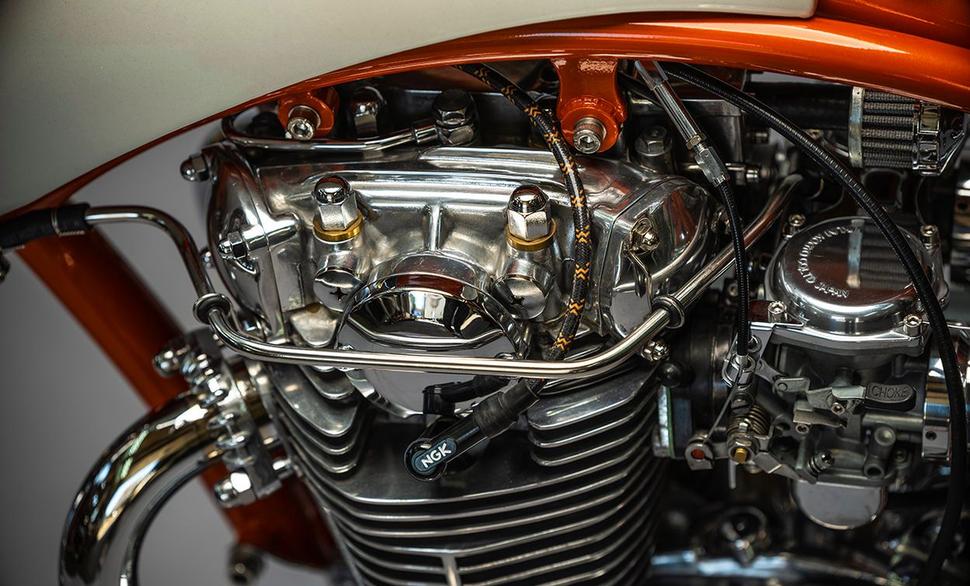 И Шон не преувеличивает, когда говорит "идеальным". Мотор Yamaha XS650 был "перефазирован" Hugh’s Hand Built - то есть, был подвергнут масштабнейшей реконструкции, в результате которой порядок вспышек изменился с 360 градусов до 277, а затем оснащён цилиндрами с большими рёбрами, электронным зажиганием и кучей свежехромированных деталей.