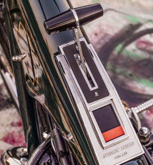 Больше всего внимания привлекает топливный бак, сделанный вручную. Мастера изготовили его из стали, они придали баку такую форму, чтобы он как бы "сидел" внутри рамы, а не на раме. В карбюраторы топливо поступает с помощью небольшого топливного насоса. Ручка на топливном баке -это не что иное, как оригинальный рычаг переключения передач Sturmey Archer. Мастера нашли его в интернет-магазине. Он выполняет две функции: эстетическую, а также включение и выключение передней фары.
