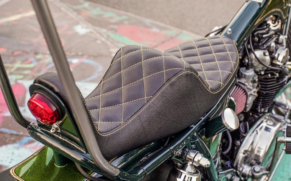Кроме того, они полностью заменили проводку, используя контроллер Motogadget m.unit. Стартер был удален, так что теперь мотоцикл можно завести только с помощью кикстартера. Что касается шасси, то братья Бендерс укоротили его и сформировали подрамник в виде петли, а затем установили ручку для пассажира очень странной пропорции. Двухместное сиденье, безусловно, единственное в своем роде, а вкупе со всей хвостовой частью оно придает мотоциклу вид настоящего ретро велосипеда с высоким рулем.