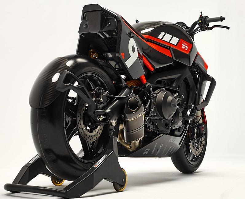 Этот экземпляр XR9 имеет пару особенностей: он оснащён карбоновым передним крылом со встроенными кожухами вилки, защитой картера, защитой звезды и задним крылом.