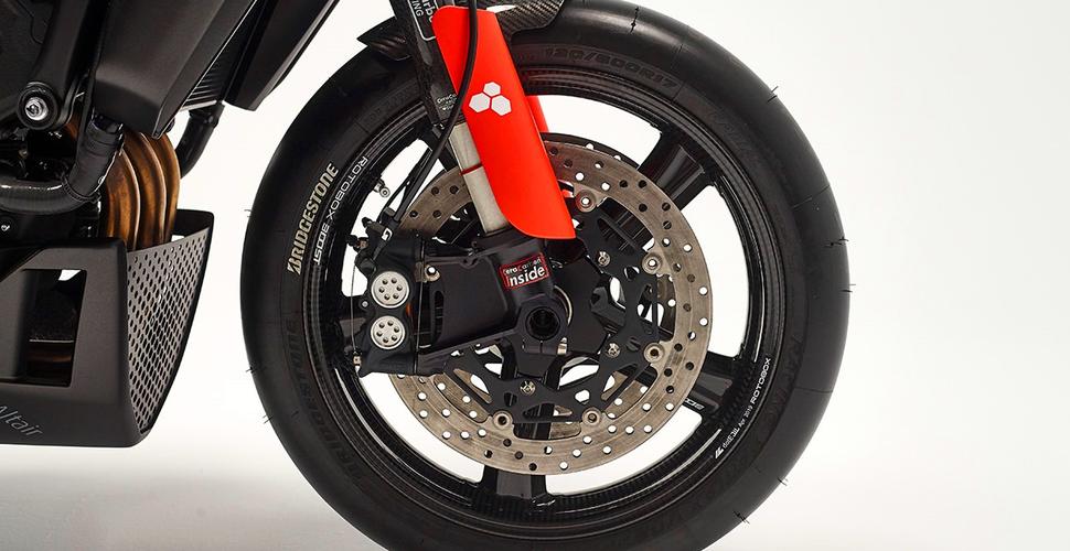 Ходовая часть включает пару карбоновых колёс Rotobox BOOST с кастомными титановыми осями, обутых в гоночные слики Bridgestone. Вилка тоже карбоновая, производства Ceracarbon, с картриджами Öhlins TTX. Задний амортизатор тоже от Öhlins, а передний тормоз позаимствован с Yamaha R1. Удивительно, но задняя звезда - ещё один карбоновый узел от Ceracarbon.