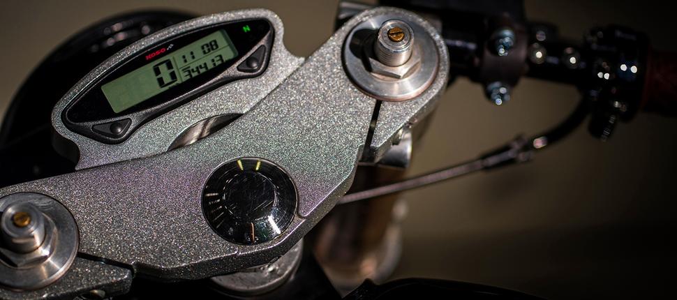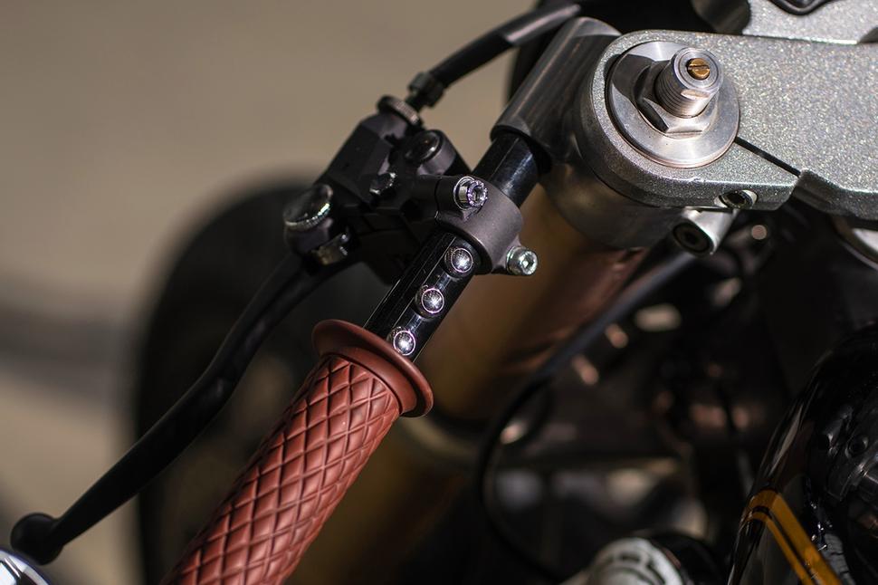 Минималистичный вид задней части потребовал скрытой проводки, которую сделали с нуля. Заодно избавились от штатных пультов и оснастили руль крайне лаконичными кнопками, поворотниками и зеркалами в торцы руля - всё ради минималистичного вида. Важный современный штрих - серьёзная диодная фара, крепко сидящая на вилке, и задние поворотники, они же - задний фонарь и стоп-сигнал. Дополняет всё это спидометр от Koso, расположенный впереди верхней траверсы и отображающий даже больше данных, чем нужно на таком мотоцикле.
