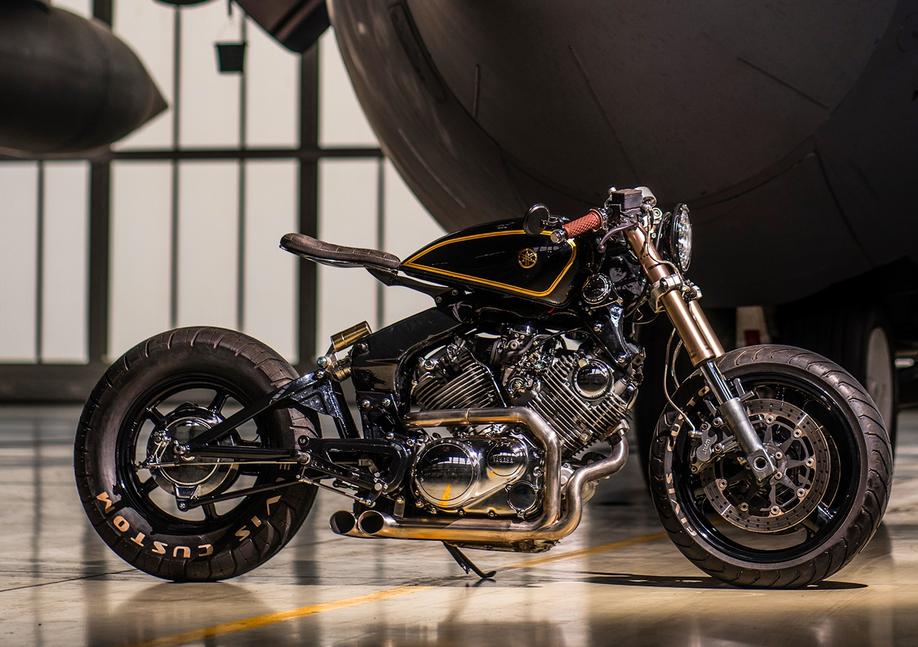 Бак установлен так, чтоб дополнить агрессивный головастый силуэт Yamaha XV750, а окраска с аэрографической окантовкой дополнительно подчёркивает прямую линию, образованную нижней частью бака и сиденьем. Золото на чёрном продолжается и на подвесках - худосочная стоковая вилка была заменена на современную перевёрнутую, установленную с заменой оси и подшипников рулевой колонки заодно. На концах её ломов установлены большие дисковые тормоза от Tokico с армированными магистралями. Сзади новый моноамортизатор с полным комплектом регуляторов проходит между элементами уникальной рамы Yamaha XV750, бесстыдно выпячивая внешний резервуар наверх.