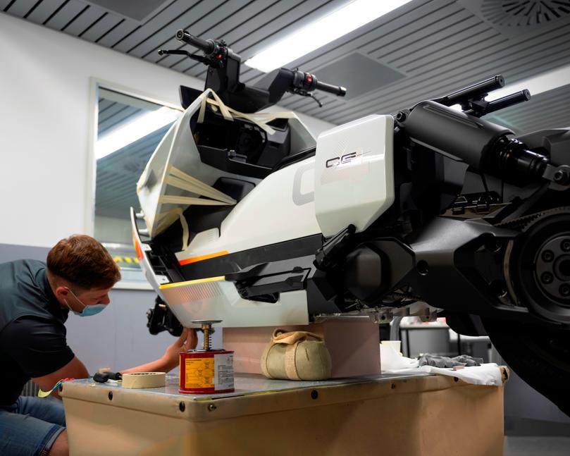 Один из ключевых элементов дизайна - это плоские аккумуляторы, расположенные снизу, благодаря чему центр масс скутера находится очень низко. Рядом расположился багажный отсек, открывающийся в бок. Продолговатый низкий корпус и диагональный передний щит подчёркнуты окраской Mineral White с ноткой металлика, а другие элементы оттенены матовым чёрным. Боковые панели скутера имеют хорошо продуманный вырез, открывающий горизонтально установленный моноамортизатор задней подвески, односторонний маятник, двигатель и рёбра охлаждения. Технология не сокрыта, а наоборот подчёркнута.