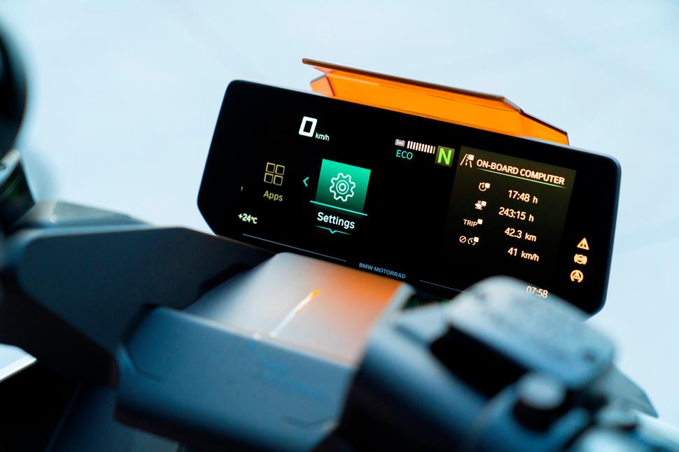 Мы вынуждены не согласиться с этой концепцией дизайнеров BMW. Скутеры - это порой очень весело, и дело далеко не только в том, чтобы летать на них как ошалелый. Хороший скутер - это чаще всего стиль и индивидуальность, даже если он крупносерийный. Европейская школа дизайна тому пример: итальянские, да и немецкие, классические скутеры превращают в стилягу самого обычного горожанина в повседневной одежде. Судя по всему, электроновинка от BMW сделана примерно с тем же посылом - ездить по городу без лишних сложностей, а значит, максимальный комфорт здесь не был в приоритете. BMW предпочтут сделать Definition CE 04 доступным, отсюда и простенькое сиденье, на котором удобно будет отсесть назад и вытянуть вперёд ноги, если того потребует дальняя дорога. Но главный посыл дизайна CE 04 совершенно непрозрачен: его внешность буквально кричит о том, что цифровой век наступил, хотим мы того или нет. И дело не только в "заправке" от розетки, но и в реализованной в базовом варианте беспроводной связи со смартфоном, и в здоровенном цифровом дисплее приборной панели с самой большой на сегодня диагональю в скутерном мире - 10,25 дюймов.