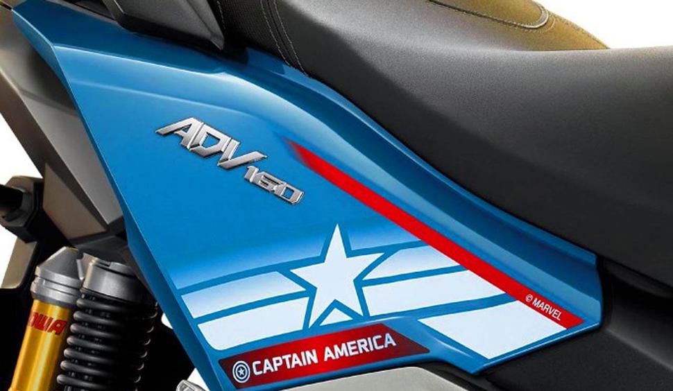 Первый Мститель (тот, который Кэп) подарил маленькой скутеретте Honda свои фирменные цвета: ярко-синюю базу и характерные цветовые акценты, а также легендарный щит (не путать с бальзамом Звёздочка), крылатый логотип в форме буквы А и несколько звёзд, украшающих передний обтекатель и боковые панели.