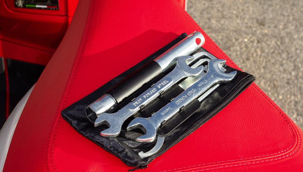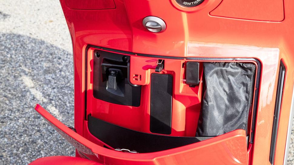 Среднеразмерный, но мощный скутер просто обязан обладать багажным объёмом. Lambretta может похвастаться небольшим перчаточным ящиком в переднем щитке, в котором также прячется набор инструмента и USB-порт для зарядки телефона. Правда, есть проблема: в полностью металлическом корпусе скутера телефон практически перестаёт видеть сеть, переходя в режим "только SOS". Так что если будете заряжать его на ходу, проще его выключить - и зарядится быстрее, и нагреется меньше. Бардачок открывается поворотом ключа в замке зажигания влево, а уже там, в бардачке, находится рычаг, который открывает сиденье. Оно открывается с кнопки, которая работает только когда включено зажигание. Под седлом находится ещё один USB-порт и относительно небольшой подседельный кофр, в который вмещается половинчатый шлем или небольшая сумка с вещами. Полнолицевой шлем туда, увы, не влез. Зато имеется подпружиненный крючок для сумок на передней части основы сиденья - это довольно удобно для перевозки пакетов с покупками на полу скутера.