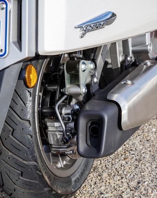 На ходу Lambretta G350 невероятно устойчива и монолитна. Как и младший собрат, 275-кубовая X300, G350 построена на весьма своеобразном шасси. Его называют полу-монокок, иными словами, несущий кузов со съёмными элементами, и именно такая конструкция и придаёт скутеру собранность и ощущение целостности. Несущий кузов более жёсткий и устойчивый, чем привычная по скутерному сегменту конструкция с нижнехребтовой рамой, и это сразу чувствуется в движении. Протискиваетесь ли вы по городским улочкам или двигаетесь со скоростью 110км/ч по шоссе (а скутер делает это легко и с удовольствием) - G350 остаётся спокойным и предсказуемым. А при необходимости эта красивая малышка разгоняется до 125км/ч.