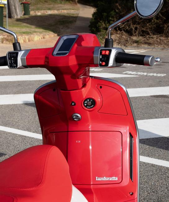 Весь свет - диодный, и видимость он даёт замечательную, особенно от фары головного света. Поворотники аккуратно встроены в обтекатель спереди, а сзади окружают задний фонарь. По всему скутеру разбросаны логотипы Lambretta, от грипс и зеркал до подножек и даже внутренней части корпусов фары и заднего фонаря. Ну, чтоб случайно не перепутали с Веспой, видимо.